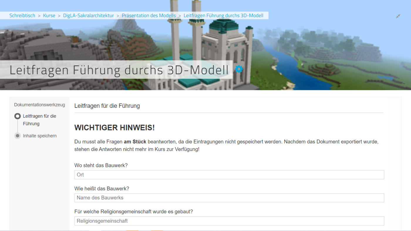 Im Rahmen der Digitalen Lernaufgabe „Sakralarchitektur weltweit“ planen und bauen die Lernenden ein virtuelles Modell eines realen oder fiktiven sakralen Bauwerks. Dabei nutzen die Schülerinnen und Schüler 3D-Software, mit der Gebäude mit virtuellen Bausteinen errichtet werden. Abschließend wird das digitale Lernprodukt der Klasse im Rahmen einer Führung durch das virtuelle Modell präsentiert. Im Zentrum dieser Aufgabe steht der Zielbereich Weg & Ziel. Durch die Möglichkeit, für die Herstellung des virtuellen Modells populäre Sandbox-Games, wie beispielsweise Minecraft, Eden, Terasology oder Minetest, einzusetzen, hat die Aufgabe einen starken Bezug zur Lebenswelt der Jugendlichen.