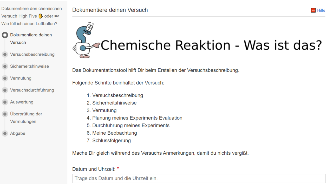 Im Kurs „Chemische Reaktionen“ erhalten die Schülerinnen und Schüler eine Forschungsfrage in Form eines Schülergesprächs und können nun selbstbestimmt einen Versuch auswählen, durchführen und dokumentieren. Dabei erfahren die Lernenden handlungsorientiert chemische Reaktionen im Alltag und werden durch kurze Videoclips angeleitet. Die Schülerinnen und Schüler nutzen im Kurs bereitgestellte Tools, beispielsweise eine digitale Bildersammlung und ein Dokumentationstool zum Erstellen ihres digitalen Versuchsprotokolls. Gleichzeitig steht ein Forum für Nachfragen und Anregungen zur Verfügung. Am Ende fasst die Klasse in einer digitalen Pinnwand die einzelnen Versuche kollaborativ zusammen. Die Lernenden erkennen Unterschiede und Gemeinsamkeiten der Versuche. Diese Digitale Lernaufgabe legt somit den Schwerpunkt auf den Zielbereich Individuum.