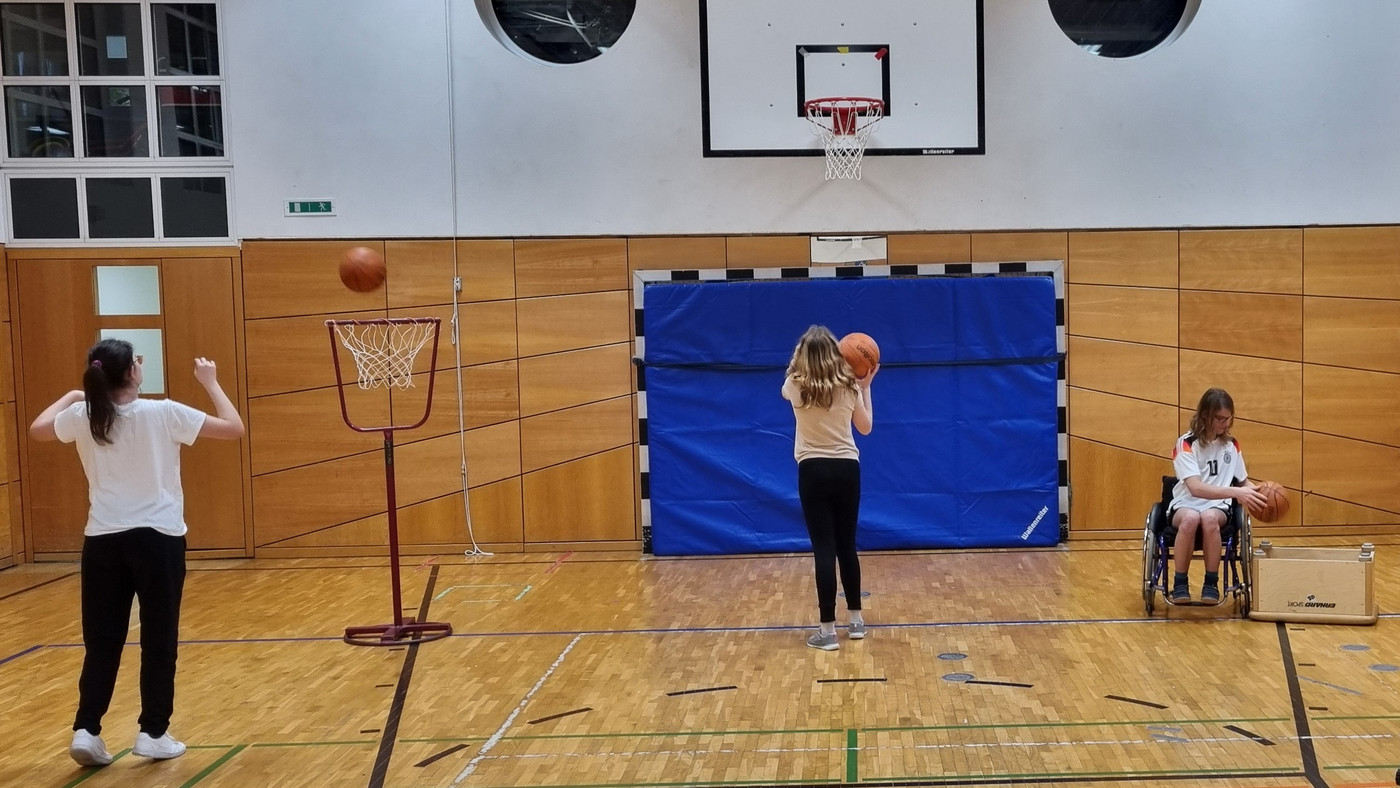 Hier im Bild: Die Kernaufgabe "Wurf mit einem Basketball" ist durch unterschiedliche Wurfziele (Korb/Kasten), Wurfentferungen und -höhen differenziert. Die Variation der Wurfhöhe und Entfernung eignet sich besonders, um auf unterschiedliche Armkraft oder Wahrnehmungsfähigkeiten zu reagieren. Alternative Wurfziele wie der Kasten ermöglichen z. B. Würfe bei reduzierter Armkraft und -kontrolle.