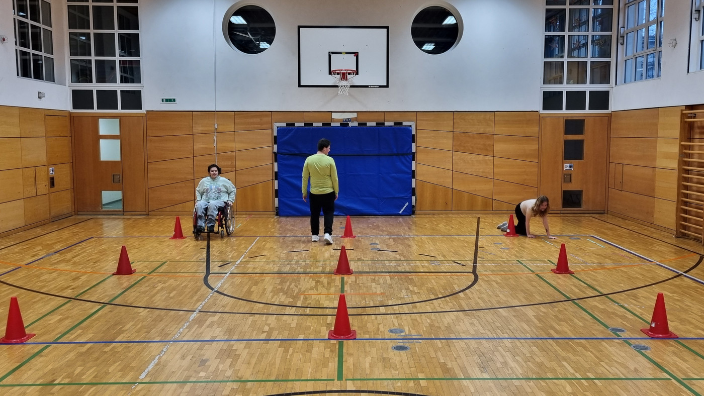Hier im Bild: Zum Zurücklegen eines Laufweges wird die Bewegungsausführung den individuellen motorischen Fähigkeiten angepasst. Links: Fahren mit dem Rollstuhl; Mitte: Laufen (z. B. bei eingeschränkter Beinmotorik); Rechts: Fortbewegung am Boden (Verlangsamung/Erhöhung der notwendigen Zeit für körperlich nicht beeinträchtigte Schülerinnen und Schüler).