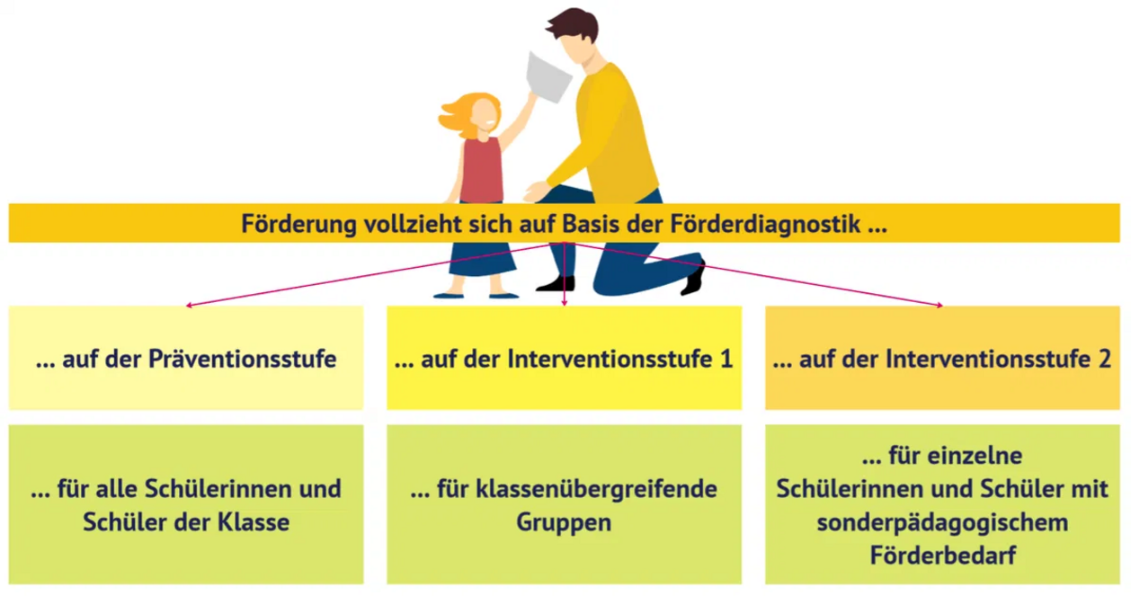 Die Förderung der Schülerinnen und Schüler vollzieht sich auf allen drei Ebenen des mehrstufigen Förderkonzepts, also auf der Präventionsstufe sowie der Interventionsstufe 1 und 2.