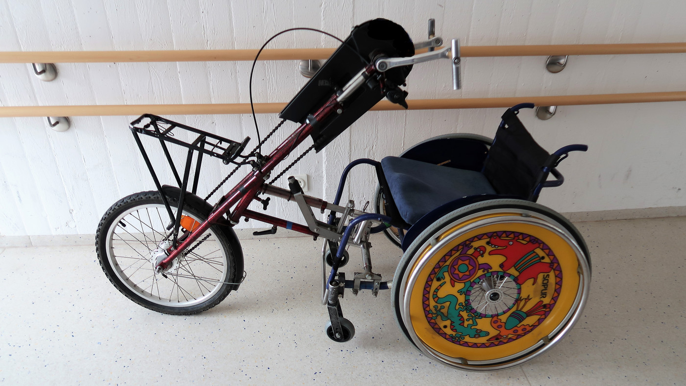 Hier im Bild: Ein Zug-Gerät bzw. "Handbike" ermöglicht es Schülerinnen und Schülern im Rollstuhl, längere Strecken (oftmals auch in höherer Geschwindigkeit) zurückzulegen.