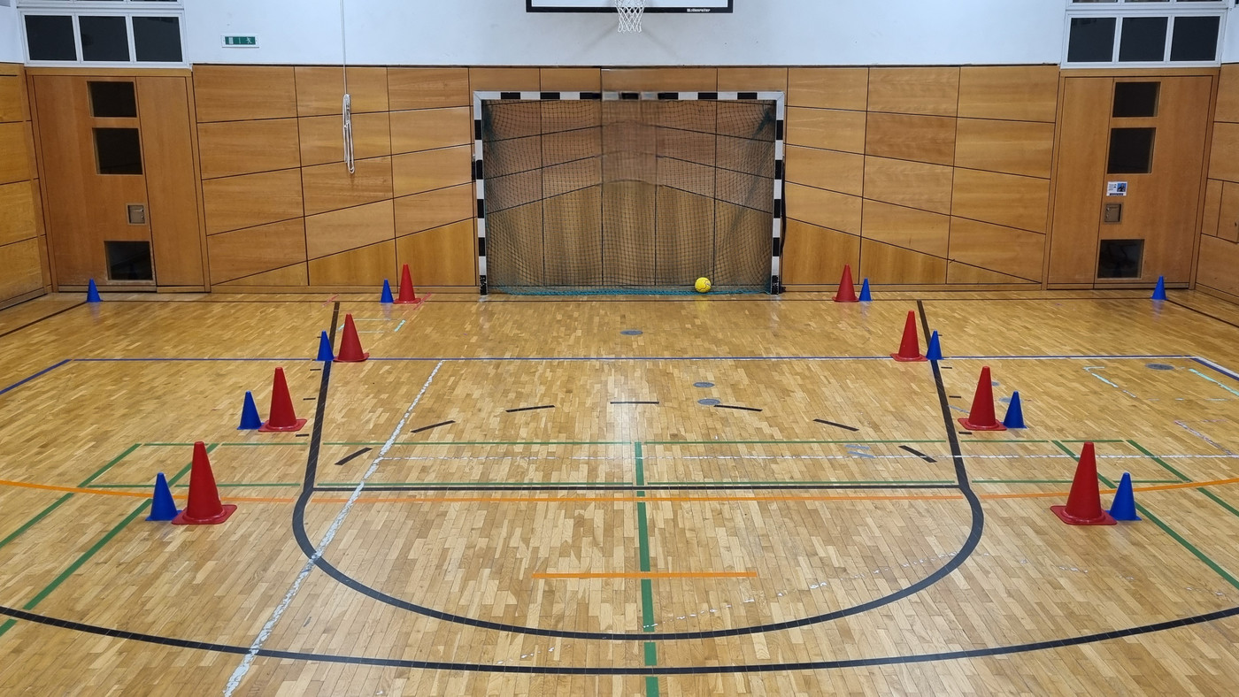 Hier im Bild: Spielfeldbegrenzungen durch Hütchen. Die farblichen Markierungen veranschaulichen das eigene und gegnerische Spielfeld statt der Bodenlinien: Spielfeld Mitte durch rote, hohe Hütchen, die Seitenspielflächen durch niedrigere blaue Hütchen. Durch die "Höhe" sind Hütchen deutlich besser wahrzunehmen, als Linien am Boden. Mögliche Nachteile durch die zusätzlichen Gegenstände sind im Einzelfall abzuwiegen und in die Sicherheitsbewertung zu integrieren.