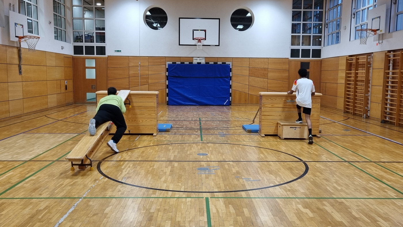 Hier im Bild: Zur gemeinsamen Aufgabenstellung "Überwinden eines Kastens" (gemeinsamer Lerngegenstand) wird der Geräteaufbau durch zwei verschiedene Aufstiegsmöglichkeiten differenziert. Der Aufbau mit der Bank stellt deutlich reduzierte Anforderungen an die motorischen und koordinativen Fähigkeiten. Der rechte Aufbau hingegen muss stehend bewältigt werden.