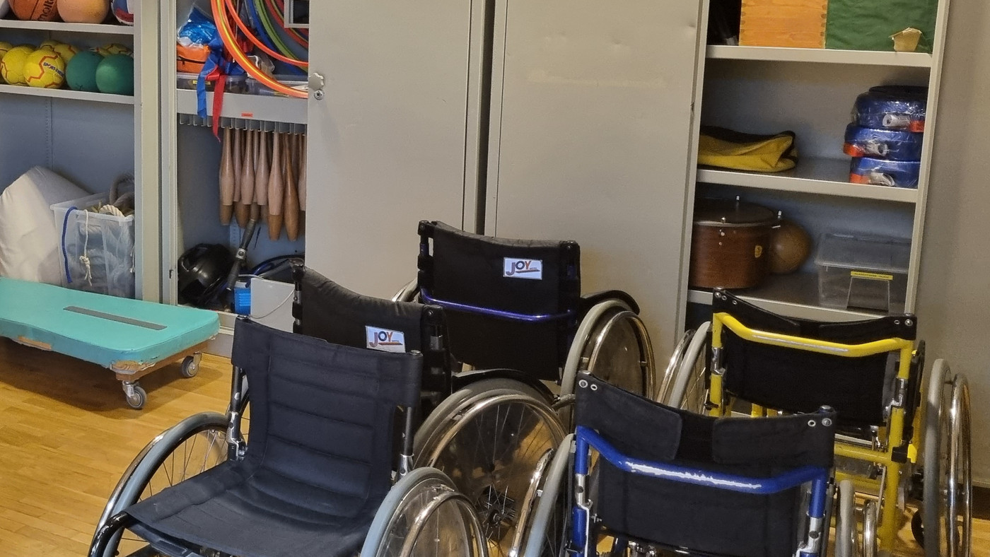 Hier im Bild: Auch Schülerinnen und Schüler ohne Förderbedarf verwenden bei einem gemeinsamen Sportspiel einen Rollstuhl. Das Beispiel ähnelt dem “Prinzip der gleichen Voraussetzungen". Dort sorgt die Aufgabenstellung für ähnliche Voraussetzungen und wird durch die einheitliche Verwendung des Rollstuhls realisiert - es wären aber auch Adaptionen ohne Material möglich. Beim Prinzip des “einheitlichen Sportgerätes” jedoch ist das Material selbst Ausgangspunkt der Planungen und gemeinsamer Lerngegenstand.