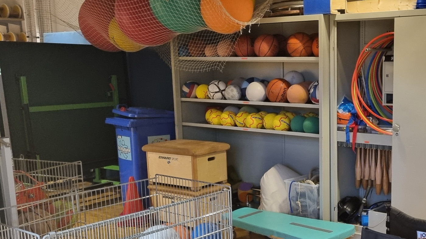 Hier im Bild: Verschiedene Ballarten hinsichtlich Größe, Gewicht, Härte, Haptik, Farbe und in der Geschwindigkeit, z. B.Zeitlupenball (reduzierte Geschwindigkeit zum Ausgleich verlangsamter Motorik/Wahrnehmung/Koordination), Gitterball (von einigen Schülerinnen und Schüler besser greifbar), Pezziball, Softball, Medizinball.