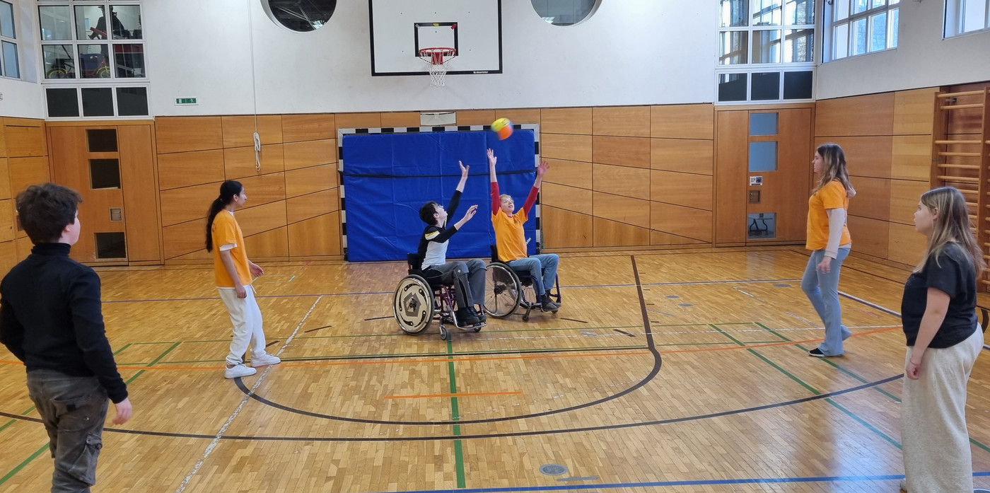 Hier im Bild: Die Mannschaften "schwarz" und "orange" bestehen jeweils aus einer Rollstuhlfahrerin oder einem Rollstuhlfahrer und zwei Fußgängerinnen oder zwei Fußgängern. Die Mitglieder der Mannschaften sind hinsichtlich der motorischen Leistung heterogen, die Spielstärke der Mannschaften jedoch chancengleich.