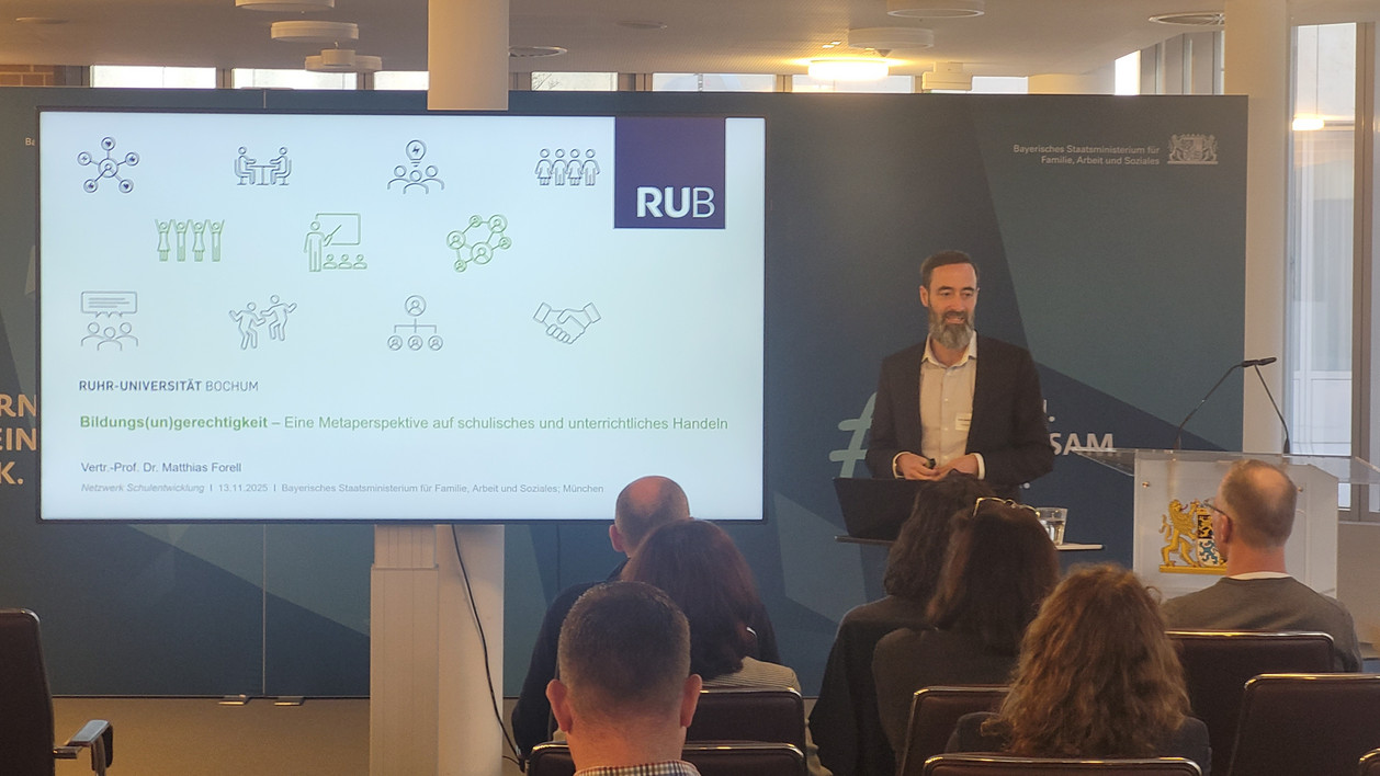 Prof. Dr. Matthias Forell (Ruhr Universität Bochum) beleuchtete in seinem Vortrag „Bildungs(un)gerechtigkeit – Eine Metaperspektive auf schulisches und unterrichtliches Handeln“ theoretische und empirische Perspektiven auf Bildungsgerechtigkeit sowie die Bedeutung der Sozialraumorientierung. Er stellte Forschungsergebnisse vor, die zeigen, wie die Perspektive der Kinder und Jugendlichen sowie die bewusste Erkundung des lokalen Umfelds (Sozialraumanalyse, Sozialraumerkundung) als diversitätssensibles und partizipatives Schulentwicklungsinstrument genutzt werden kann.