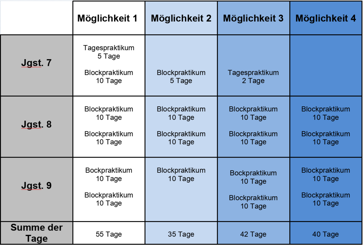 Folgende Tabelle zeigt verschiedene Möglichkeiten auf, wie Betriebspraktika in den Jahrgangsstufen 7-9 organisiert werden können: